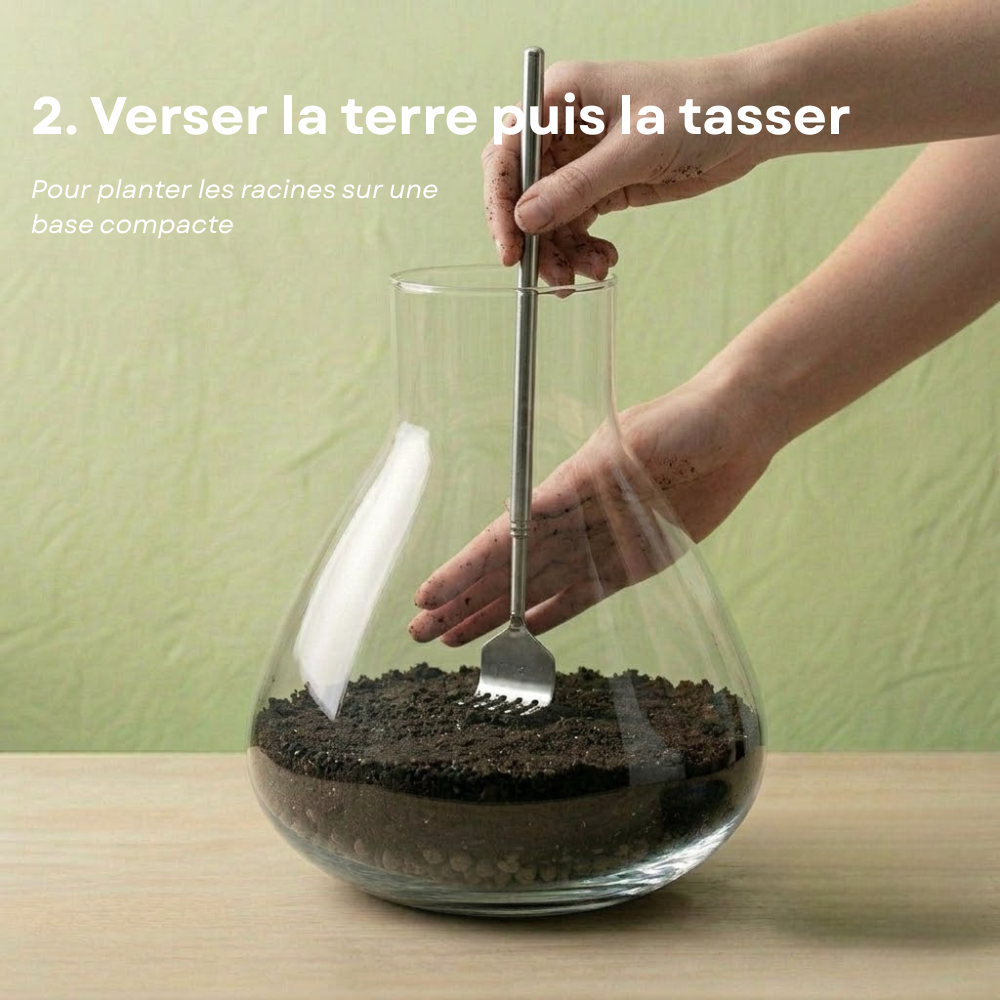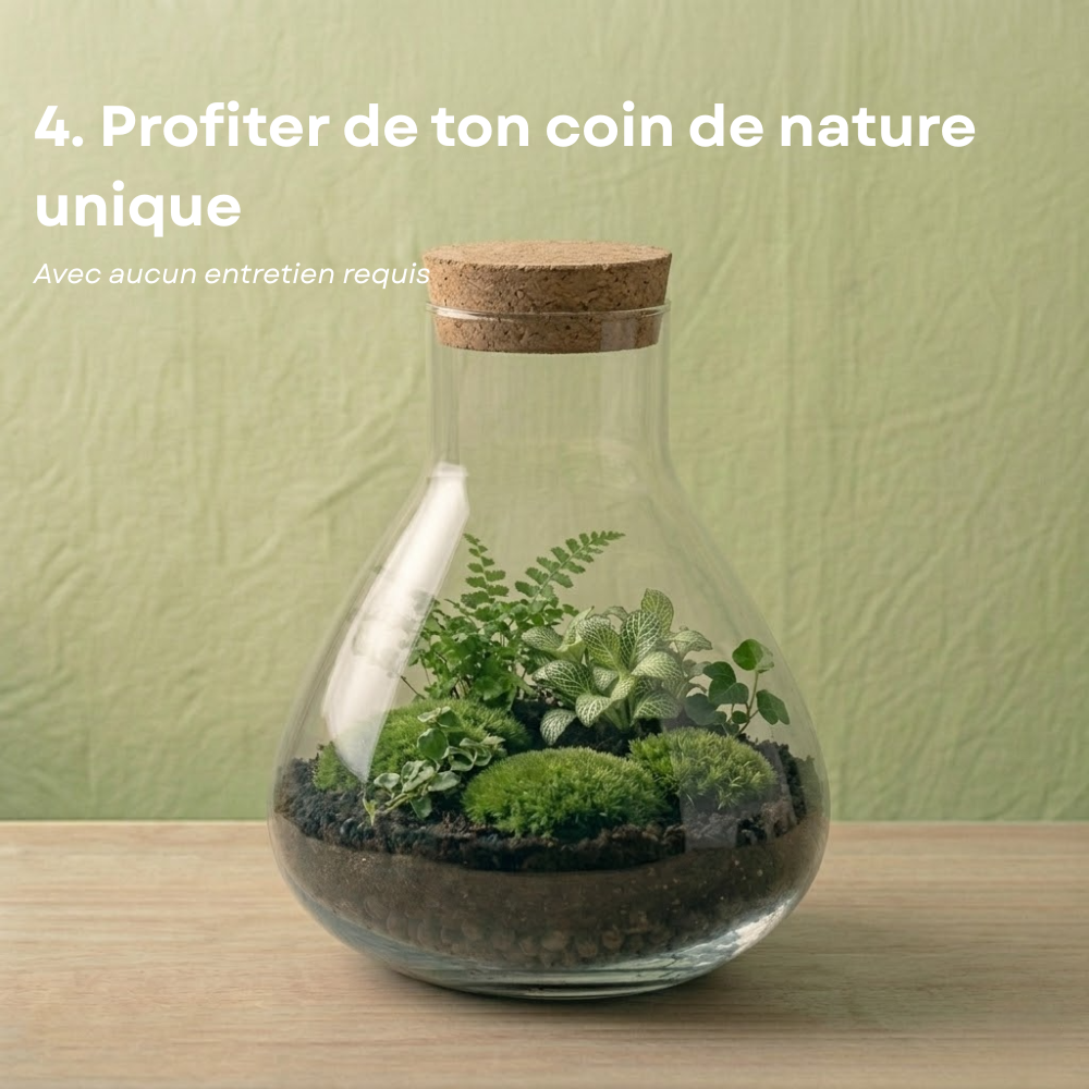 C'est exactement pour ça que ce kit existe. Le terrarium fermé crée un écosystème autonome. Les plantes se nourrissent de leur propre cycle d'humidité, donc il n'y a presque rien à gérer.