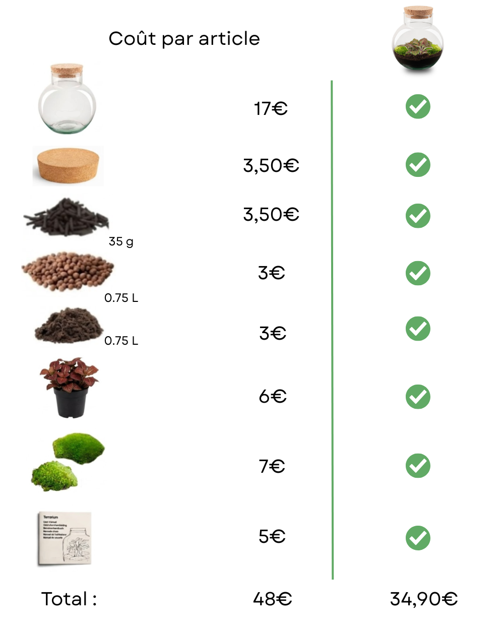 Le problème, c'est que trouver tout ça séparément — le bon bocal, le bon substrat, les bonnes plantes qui vont vraiment s'entendre dans un espace fermé — ça prend du temps, ça coûte cher, et ça décourage avant même de commencer.